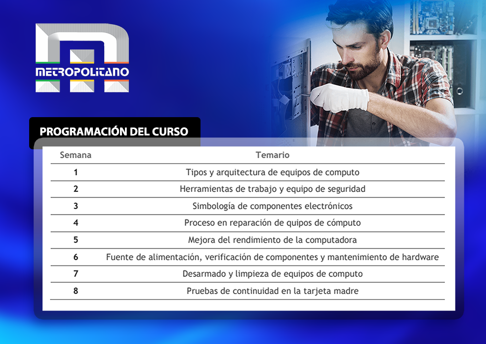 Tu formación te permitirá ser capaz de describir los componentes internos de la computadora, solucionar todo tipo de problemas haciendo usos de software de diagnostico y herramientas del